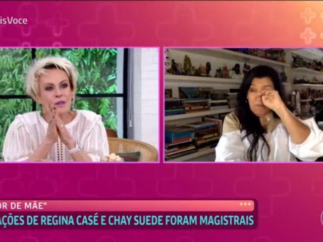 Protagonista de uma das cenas mais esperadas do horário nobre da Globo nos últimos tempos, Regina Casé chorou ao participar do "Mais Você" na manhã desta sexta-feira (9). LEIA TAMBÉM: Gretchen passa por cirurgia de emergência: “Muito delicada” “Amor de Mãe”: Thelma falsifica documentos para deixar Brasil com o neto Novo herdeiro? Em vídeo, Andressa Suita pergunta se filho quer um irmão Inovador: Record usa ‘robô bebê’ em cena de “Gênesis” e público não percebe A atriz bateu papo com Ana Maria Braga sobre seu trabalho em "Amor de Mãe" e não segurou as lágrimas ao rever o encontro de sua personagem, Lurdes, com o filho, Domênico/Danilo (Chay Suede). A veterana fez questão de exaltar a parceria com o colega de cena e também toda a equipe envolvida na produção do folhetim de Manuela Dias. "Eu já assisti três vezes a essa cena e choro em todas", contou a apresentadora, também com lágrimas nos olhos. Ainda sobre o trabalho, a protagonista da trama contou que chegou a conversar com seu terapeuta sobre o tempo em que ficou longe dos folhetins. Contudo, chegou à conclusão de que não se arrepende. "Os anos em que fiz projetos como o 'Central da Periferia', 'Programa Legal', 'Muvuca', 'Esquenta' me preparam para fazer a Lurdes. Se eu não tivesse viajado por 30 anos, eu faria essa Lurdes?", avaliou. Ana Maria bem que tentou arrancar spoilers sobre o fim da novela, mas não conseguiu. "Não posso falar, mas acho impressionante a amizade da Thelma [Adriana Esteves] e a Lurdes", comentou. E por falar em amizade, Regina ganhou depoimentos de Adriana Esteves e Thaís Araújo, as outras duas protagonistas da história, e garantiu que o projeto foi uma prova de que é mito a história de que mulheres devem ser rivais. "Nós três só crescemos, só nos ajudamos e somos mais amigas do que antes. Sororidade, ficamos irmãs mesmo. Isso foi muito bonito", garantiu sobre a relação dentro e fora das telinhas.