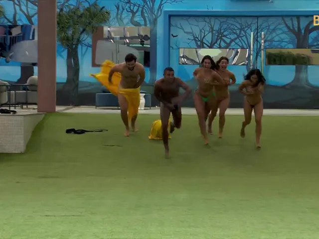 Durante a tarde, os integrantes do quarto ‘fadas’ decidiram se unir e cumprir a promessa: Alane, Bia e Cunhã saltaram seminuas na piscina, ao lado do motorista de aplicativo e Alegrete, completamente nus.