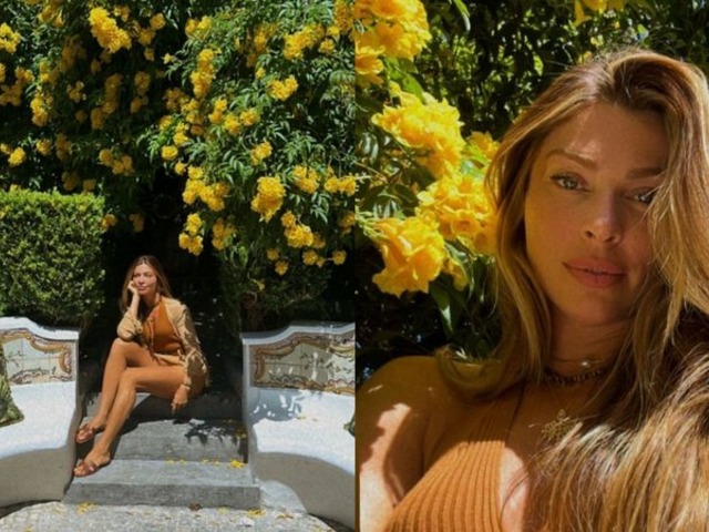 Já em Cascais, onde estão curtindo a primeira parte da viagem, usando um look de tons terrosos que combinam com o local, a atriz posou em um famoso restaurante da região com as flores e decoração do local.
