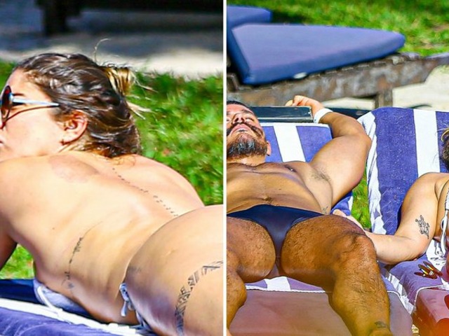 De biquíni fio-dental, a musa foi flagrada dourando o corpão em um hotel na Bahia. Nos flagras registrados por um fotógrafo, os dois surgem exibindo seus corpos saradíssimos.
