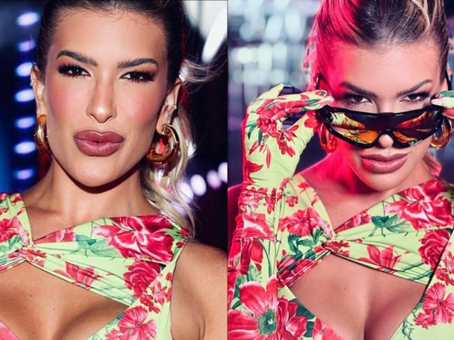 É que a loira compareceu a um show de Xand Avião e investiu muito no visual: ela elegeu um vestido a vácuo com muitos recortes diferentões na região da barriga. Inclusive, o decote profundo fez os seios turbinados da musa ficarem ainda mais em evidência.