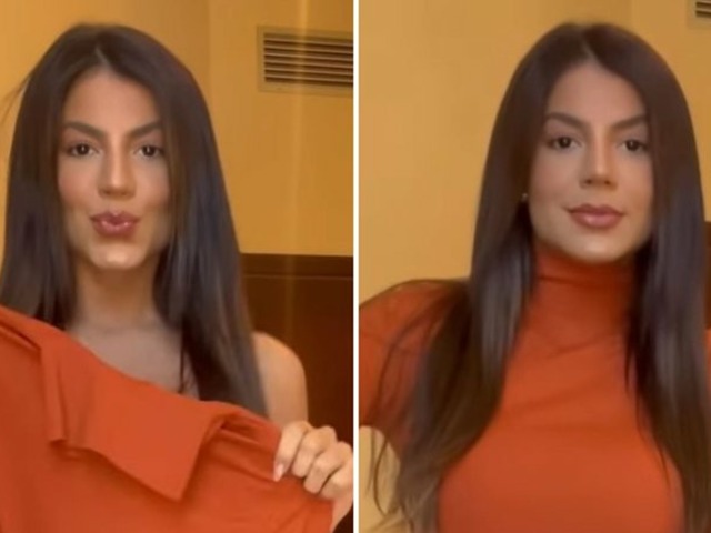 No vídeo, ela aparece com um vestido de mangas longas com as costas abertas, uma bandana estilosa e óculos de sol, além de alguns acessórios e uma bolsa de luxo.