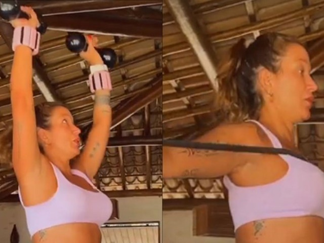 A loira, que sempre teve um corpão sequinho e uma barriga trincadíssima, surgiu com as curvas belíssimas da gravidez enquanto se dedicava intensamente a uma sequência de exercícios físicos.