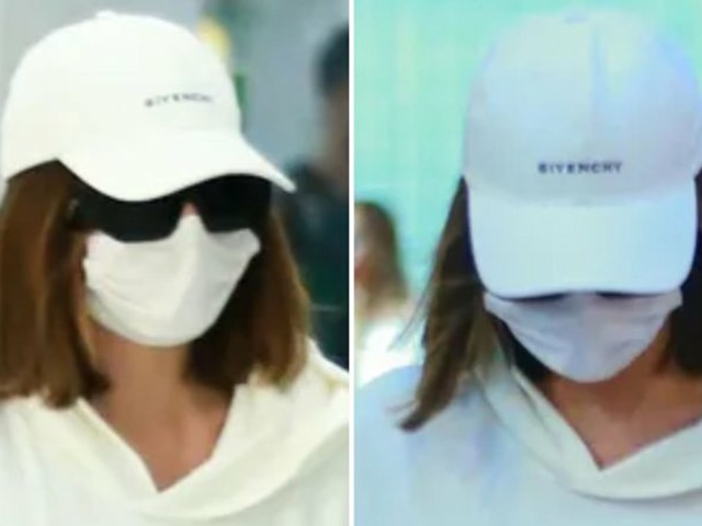 Ao desembarcar no Aeroporto Santos Dumont, no Rio, a artista se disfarçou com um moletom, boné, máscaras e óculos escuros.