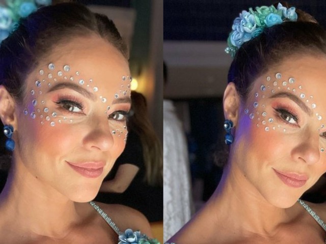 Ela estava com um look bem extravagante azul, cheio de brilhos. Até a maquiagem impecável estava combinando, e tinha algumas pérolas em seu rosto.