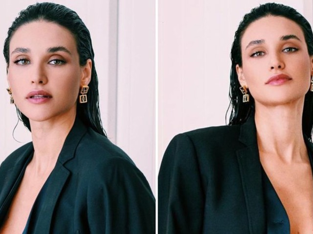 Nas fotos, a artista aparece em um look de alfaiataria. Ela vestiu um colete, um blazer e uma calça preta, mas, por estar sem sutiã, a beldade quase deixou os seios escaparem.
