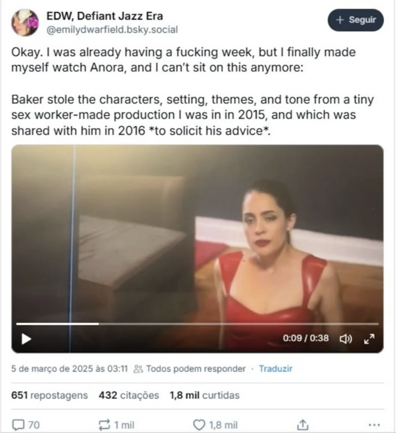 O diretor premiado do Oscar, Sean Baker, está sendo acusado de plágio por uma série de publicações na rede social Bluesky. Emily Warfield, em suas postagens, afirma que Baker teria plagiado uma produção de 2016 para seu filme "Anora", que conquistou cinco estatuetas no último domingo, incluindo melhor filme, atriz (Mikey Madison), roteiro original, montagem e direção. Warfield alega que o longa estrelado por Mikey Madison se apropriou de personagens, cenário e temas de um projeto chamado "The skill set", idealizado por Alana Massey e que não foi completamente produzido devido à falta de recursos.