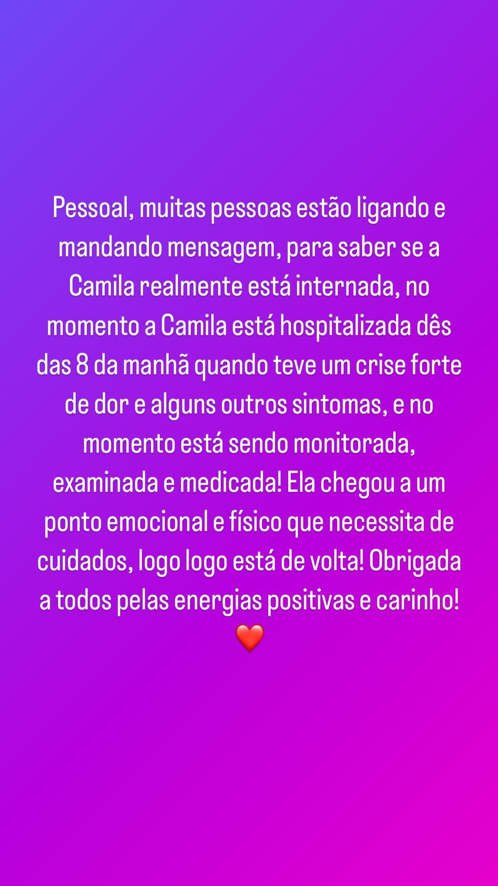 Ainda não há maiores informações sobre o quadro de saúde de Camila, mas espera-se que em breve mais detalhes sejam divulgados.