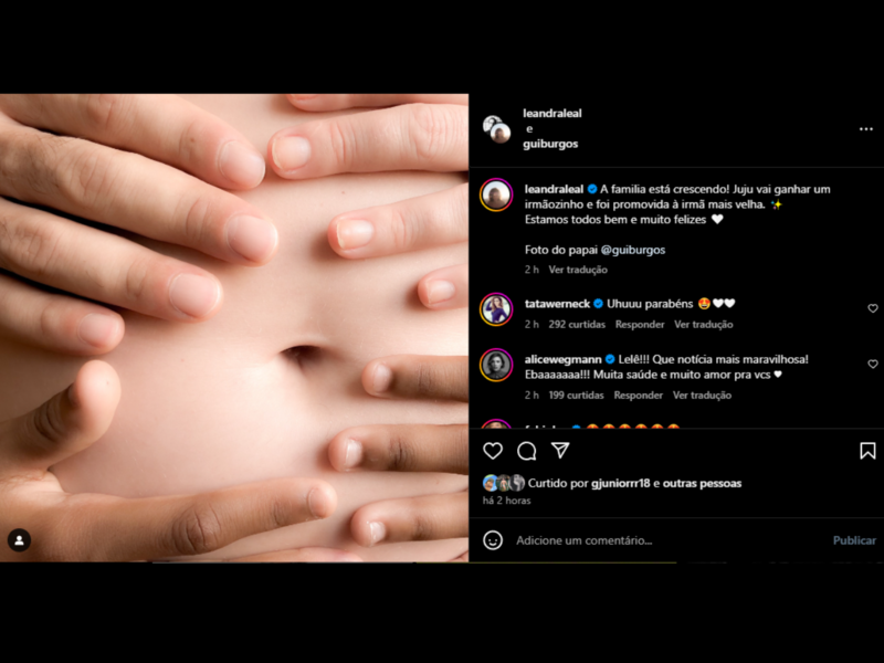"A familia está crescendo! Juju vai ganhar um irmãozinho e foi promovida à irmã mais velha. Estamos todos bem e muito felizes", escreveu Leandra na legenda da foto.