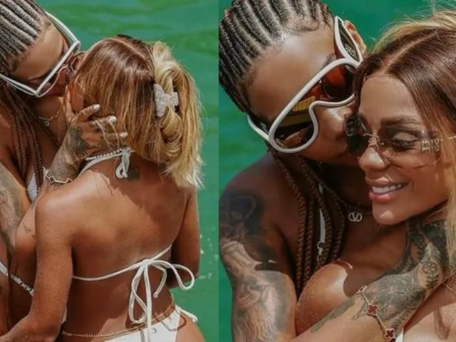 Com um biquíni branco, Ludmilla aparece aproveitando o clima de romance com a namorada em seu colo a bordo de sua moto aquática. O casal ainda protagonizou momentos sensuais, trocando beijos e gestos carinhosos.