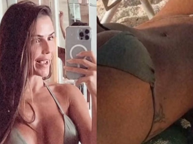 A famosa apostou em um modelito minúsculo e bem cavado, no estilo cortininha o biquíni verde militar exaltou suas curvas de dar inveja e Deborah quase mostrou demais.