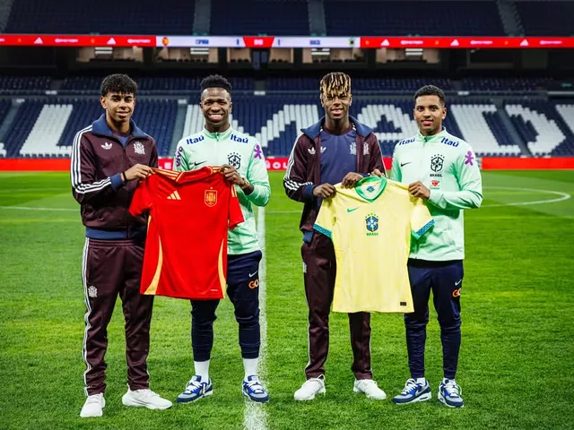 Nesta terça-feira, a Federação Espanhola (RFEF) reuniu quatro estrelas da LaLiga para promover o amistoso entre Espanha e Brasil no Santiago Bernabéu. Lamine Yamal, do Barcelona, Vini Jr. e Rodrygo, do Real Madrid, e Nico Williams, do Athletic Bilbao, se encontraram no gramado, em uma ação simbolizando o slogan do jogo: "Uma só pele".