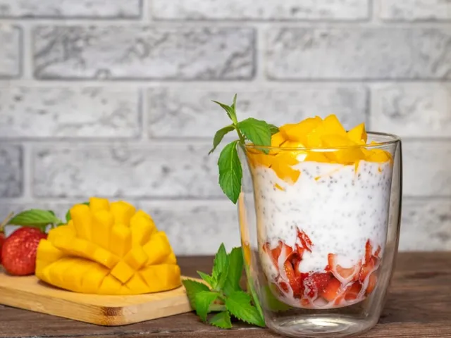 Em um recipiente, misture as sementes de chia, o leite de amêndoas, o iogurte, o extrato de baunilha e o mel. Mexa para incorporar os ingredientes e certifique-se de que as sementes de chia estejam bem distribuídas. Cubra com plástico-filme e leve à geladeira por 2 horas. Antes de servir, mexa para garantir uma textura uniforme. Em potinhos individuais, coloque um pouco de morango no fundo, cubra com o pudim e adicione a manga por cima. Sirva em seguida.
