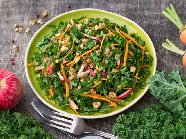 Em uma tigela, misture a couve, a cenoura, as nozes e a maçã. Tempere com o suco de limão, o azeite, o sal e a pimenta-do-reino. Sirva em seguida.