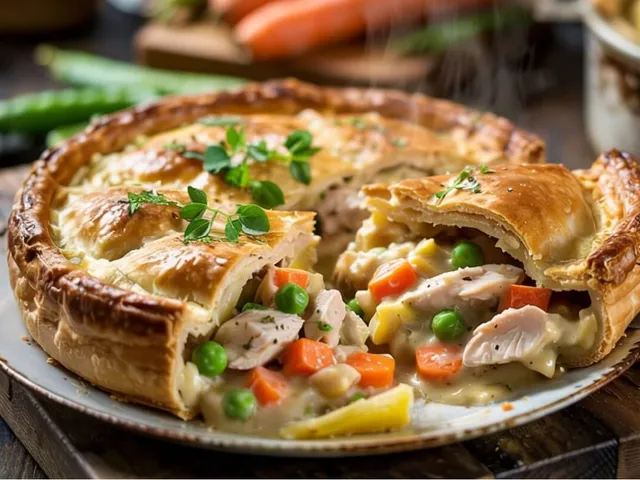 Abra a massa com um rolo e use metade dela para forrar uma assadeira redonda. Espalhe o recheio cremoso de frango e legumes. Cubra com a outra metade da massa, pincele com ovo batido e leve ao forno preaquecido a 180 °C por cerca de 35 minutos, até dourar. Sirva em seguida.