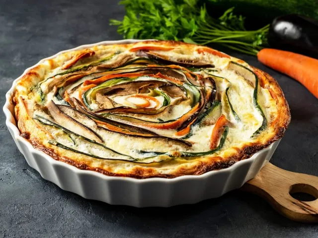 Em uma tigela, bata os ovos, o leite e a ricota até formar um creme liso. Tempere com sal, pimenta-do-reino e noz-moscada. Despeje o creme sobre a massa pré-assada. Disponha as tiras de abobrinha, cenoura e berinjela em formato espiral. Regue com um fio de azeite. Leve ao forno preaquecido a 180 °C por aproximadamente 30 a 35 minutos, até dourar levemente e firmar o recheio. Sirva em seguida.