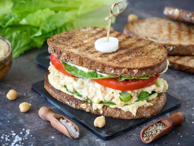 Para montar o sanduíche, toste as fatias de pão em uma panela antiaderente em fogo médio e espalhe o patê de grão-de-bico sobre uma delas. Acrescente as folhas de alface e o salsão e cubra com uma camada de patê. Disponha as rodelas de tomate e alface e cubra com mais uma camada de patê. Finalize com a outra fatia de pão e sirva em seguida.