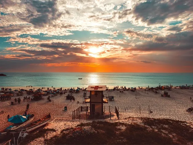 As praias de Arraial do Cabo têm fama de Caribe brasileiro, mas o que muita gente não espera é a beleza do pôr do sol nos mirantes da região. O do Pontal do Atalaia é o mais famoso: lá do alto, é possível ver o sol se pondo sobre o mar em um cenário que mistura azul e dourado.