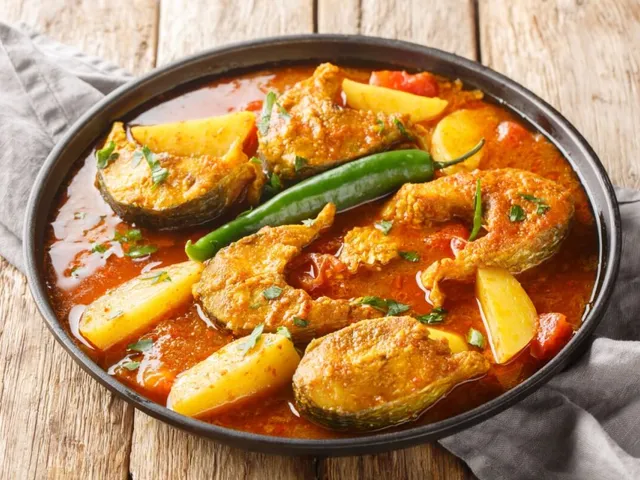 Acrescente as batatas na panela e cubra com água quente. Deixe ferver até que as batatas estejam quase macias. Tempere com sal e pimenta-do-reino e coloque as postas de peixe cuidadosamente sobre as batatas. Reduza o fogo e cozinhe por 10 minutos. Desligue o fogo e finalize com a pimenta-verde e o coentro. Sirva em seguida.
