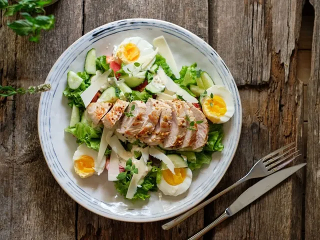Em um recipiente, coloque o peito de frango e tempere com sal e pimenta-do-reino. Transfira para um frigideira antiaderente e leve ao fogo médio até dourar. Desligue o fogo e corte em fatias. Reserve. Em uma panela, coloque os ovos, cubra com água e leve ao fogo médio para cozinhar por 7 minutos.