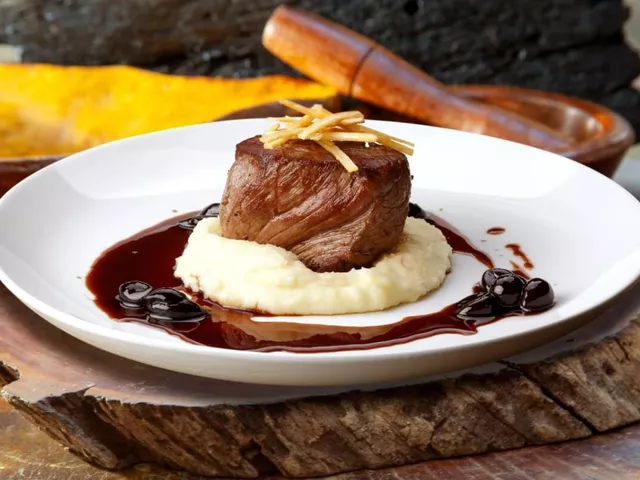 Filé-mignon com purê de batata e molho de vinho tinto