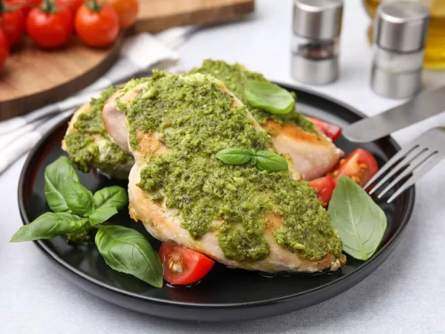 Em um recipiente, tempere os peitos de frango com sal e pimenta-do-reino. Aqueça uma frigideira ou grelha em fogo médio-alto com azeite e sele os peitos de frango por aproximadamente 4-5 minutos de cada lado, até dourar e cozinhar completamente por dentro. Retire o frango do fogo e espalhe o molho pesto por cima, garantindo uma cobertura generosa. No prato, disponha os tomates-cereja cortados ao meio e finalize com folhas frescas de manjericão.