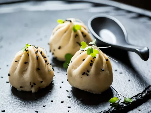 Forre uma panela de metal para cozimento a vapor com papel-manteiga. Disponha os dumplings sobre ela e cozinhe por 12 minutos em fogo baixo. Depois, retire os dumplings do vapor, salpique gergelim preto e decore com os brotos de alfafa. Sirva em seguida.