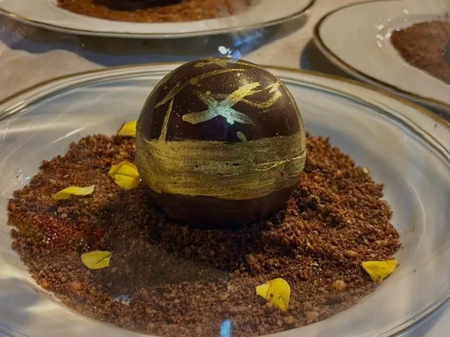 Esfera de chocolate com entremet de coco e manga e calda de chocolate (por chef Zeki)