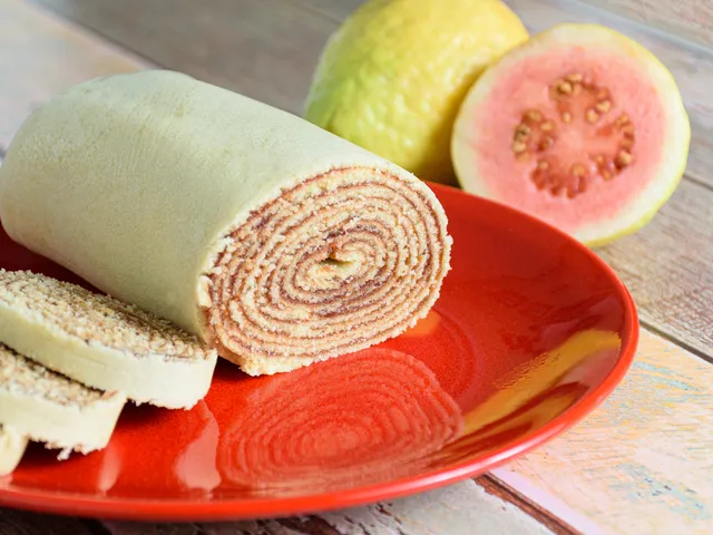 Vire a massa da forma sobre um pano úmido e polvilhado com açúcar. Passe uma camada bem fina de goiabada sobre o bolo e enrole. Faça isso com todos os bolos, enrolando um por cima do outro. Sirva em seguida.