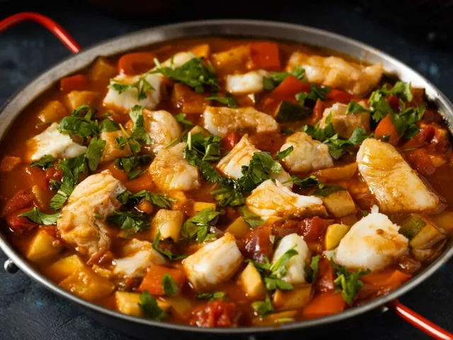 Em uma panela grande, aqueça o azeite em fogo médio e refogue a cebola e o alho até dourar. Adicione o tomate, a páprica e cozinhe por 5 minutos, até formar um molho rústico. Acrescente as batatas, a cenoura, a abobrinha e o pimentão. Misture bem. Tempere com sal e pimenta-do-reino. Adicione o caldo de peixe até quase cobrir os legumes. Tampe e deixe cozinhar em fogo médio por cerca de 15 a 20 minutos, até os legumes estarem macios. Adicione o bacalhau sobre os legumes. Tampe novamente e cozinhe por mais 10 a 15 minutos, até o peixe ficar macio. Desligue o fogo, polvilhe a salsinha picada por cima e sirva em seguida.