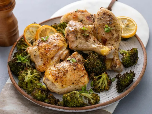Espalhe os floretes de brócolis e as fatias de limão-siciliano ao redor do frango. Leve ao forno preaquecido a 200 °C por cerca de 40 a 50 minutos, ou até que o frango esteja bem dourado e cozido por dentro, e o brócolis levemente tostado nas bordas. Se necessário, vire o brócolis na metade do tempo para assar por igual. Finalize com as folhas de manjericão fresco e sirva em seguida.