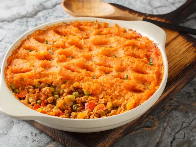 Em seguida, em um refratário, distribua a carne de frango refogada e cubra com o purê de batata-doce. Nivele com uma colher, fazendo leves marcas na superfície, e leve ao forno preaquecido a 200 °C por 20 minutos. Retire, finalize com cheiro-verde e sirva imediatamente.