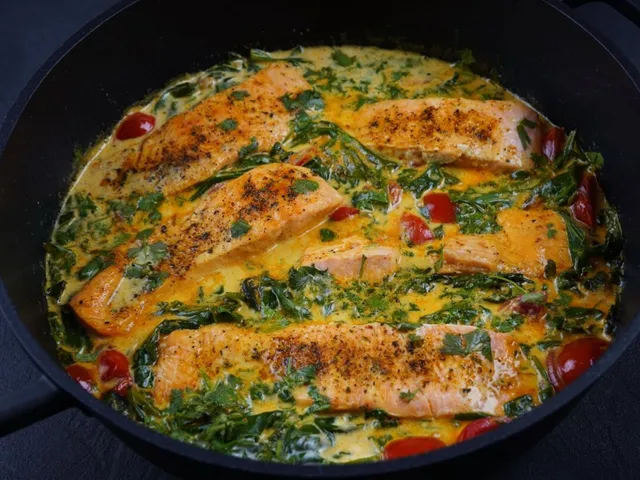 Acrescente o iogurte natural, o leite de coco e a páprica, misturando bem até formar um molho cremoso. Tempere com sal. Adicione o espinafre fresco e mexa até que murche no molho. Volte os filés de salmão para a frigideira, regue com o suco de limão e deixe cozinhar em fogo baixo por mais 5 minutos, até que o peixe esteja cozido por dentro e envolto no molho. Finalize com salsinha e sirva em seguida.