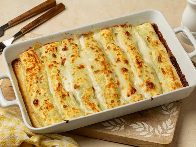 Sobre cada folha de massa de lasanha, coloque uma porção do recheio de abóbora e enrole, formando canelones. Unte um refratário com manteiga e disponha os rolinhos lado a lado. Cubra com o molho branco e polvilhe queijo parmesão por cima. Leve ao forno preaquecido a 200 °C até dourar levemente. Sirva em seguida.