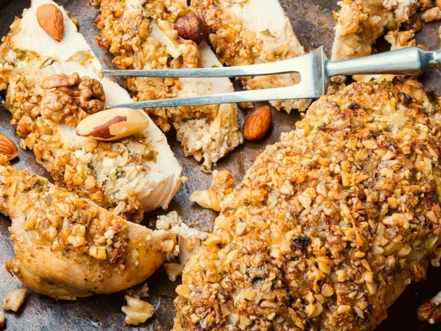 Após, retire os filés de frango da geladeira, pincele com azeite de oliva e pressione contra a mistura de nozes e castanhas para formar uma crosta por cima. Disponha em uma assadeira com papel-manteiga e leve ao forno preaquecido a 200 °C por 30 minutos. Sirva em seguida.