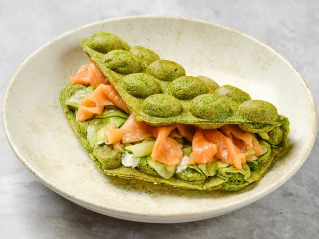 Sanduíche waffle de matcha com salmão