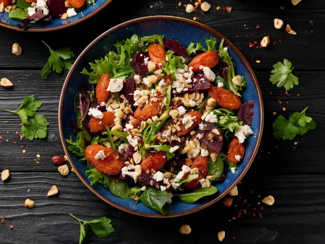 Salada morna de beterraba com cenoura, queijo feta e avelãs