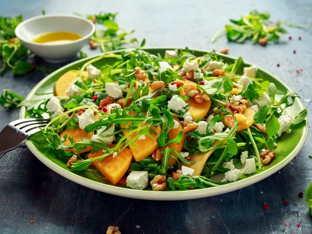 Salada de rúcula com caqui e nozes