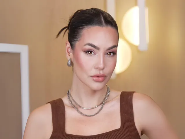 Bruna Malheiros indica realçar os contornos do rosto com um produto cremoso em tom neutro quente, aplicado em regiões estratégicas para dar profundidade de forma suave e natural. Em seguida, sugere usar corretivo apenas em pontos pontuais, garantindo correção leve e sem pesar no visual.