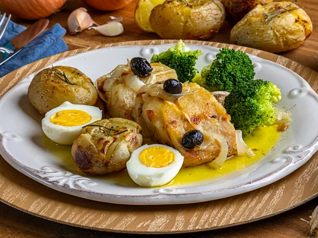 Em uma assadeira untada com azeite, coloque as postas de bacalhau, distribua as batatas ao redor e regue com azeite. Acrescente o tomilho, o alho e a pimenta-do-reino. Leve ao forno preaquecido em temperatura média até dourar. Após, retire do forno e decore com azeitonas pretas, os ovos cozidos e o brócolis. Sirva em seguida.
