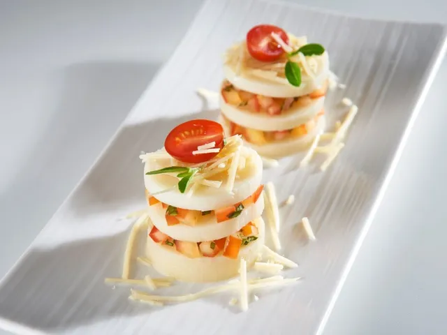 Em um recipiente, misture o tomate com sal, pimenta-do-reino e um fio de azeite de oliva. Em um prato, faça camadas alternadas de rodelas de palmito, tomate e queijo parmesão ralado. Decore com folhas de manjericão e tomate-cereja. Se desejar, regue com um fio de azeite de oliva. Sirva em seguida.