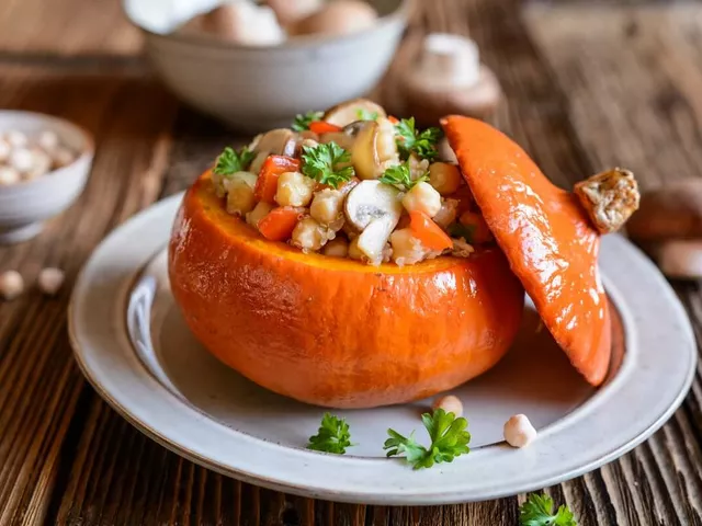 Corte o topo da abóbora e, com o auxílio de uma colher, retire as sementes. Coloque a abóbora em uma forma, regue-a com azeite e leve ao forno médio preaquecido por 25 minutos. Enquanto isso, em um recipiente, misture o grão-de-bico, a quinoa, os cogumelos, a cebola, o pimentão, o sal e a pimenta-do-reino. Retire a abóbora do forno, recheie com a mistura e leve ao forno novamente por mais 7 minutos. Sirva em seguida.