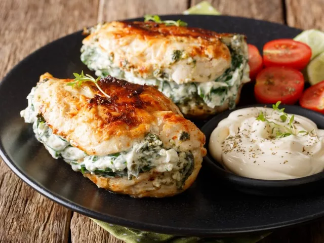 Em um recipiente, tempere os peitos de frango com sal, tomilho, alecrim, molho de soja, suco de laranja e pimenta-do-reino. Deixe descansar por 15 minutos. Em uma frigideira, coloque o azeite de oliva e leve ao fogo médio para aquecer. Adicione os peitos de frango e doure os dois lados. Depois, corte os peitos de frango na horizontal, sem separar e, com a ajuda de uma colher, recheie-os com o creme de espinafre. Sirva em seguida.