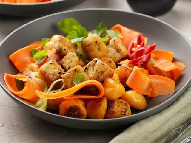 Seque bem os cubos de tofu com papel-toalha. Em uma tigela, tempere com molho de soja, alho em pó e pimenta-do-reino. Passe os cubos no amido de milho. Aqueça uma frigideira com um fio de azeite em fogo médio e grelhe até ficarem dourados e crocantes de todos os lados. Em um prato, adicione o nhoque ainda quente com os cubos de tofu, a cenoura fatiada e a pimenta dedo-de-moça. Finalize com as folhas de manjericão e sirva em seguida.