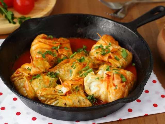 Em uma panela, coloque a água e leve ao fogo médio para ferver. Escalde as folhas de repolho na água e reserve. Em um recipiente, coloque a carne moída, a cebola, o milho-verde, o sal e a salsinha e misture. Após, coloque um pouco de recheio em cada metade das folhas de repolho, dobre as pontas sobre ele e enrole como um rolinho. Reserve.