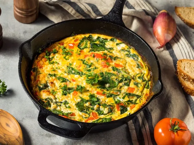 Em uma tigela, bata os ovos até ficarem homogêneos. Reserve. Em uma frigideira, aqueça o azeite em fogo médio e adicione a cebola e o alho, refogando até dourar. Acrescente o espinafre, o tomate e o pimentão, refogando até ficarem macios. Despeje os ovos batidos sobre a mistura na frigideira e deixe cozinhar, sem mexer, até que as bordas estejam firmes. Com uma espátula, vire delicadamente. Cozinhe até dourar e sirva imediatamente.