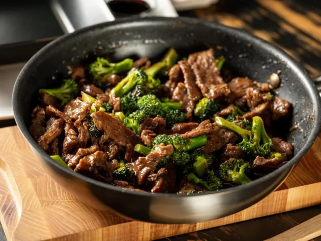 Em um recipiente, coloque a carne e tempere com sal, pimenta-do-reino e vinagre de arroz. Reserve. Em uma panela, coloque o azeite e leve ao fogo médio para aquecer. Adicione a cebola e o alho e doure. Junte a carne e refogue até perder a cor avermelhada. Em um recipiente, dilua o amido de milho no caldo de legumes. Acrescente o brócolis à panela com a carne e misture. Adicione o caldo de legumes e cozinhe até o brócolis ficar macio. Desligue o fogo e sirva em seguida.