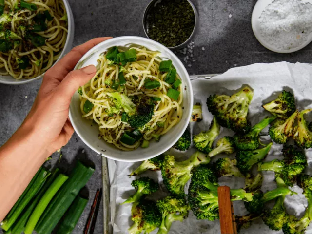 Em uma panela, coloque a água e leve ao fogo médio para ferver. Adicione uma colher de sopa de sal e o macarrão e cozinhe até ficar al dente. Desligue o fogo, escorra a água e reserve. Em uma frigideira, coloque o óleo e leve ao fogo médio para aquecer. Acrescente o alho e doure. Junte o brócolis e refogue por 3 minutos. Despeje o vegetal refogado sobre o espaguete e mexa para incorporar. Desligue o fogo e polvilhe com cebolinha e gergelim. Sirva em seguida.