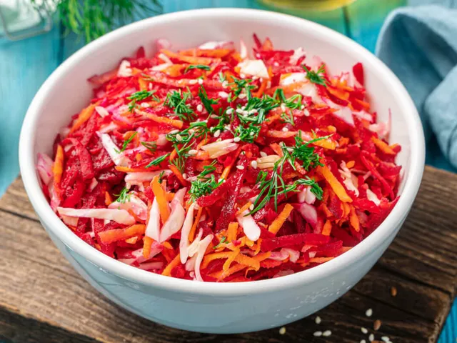 Em um recipiente, coloque a beterraba, a cenoura, o repolho, o suco de limão e o azeite e misture bem. Tempere com sal e pimenta-do-reino. Polvilhe com gergelim e decore com o endro. Sirva em seguida.