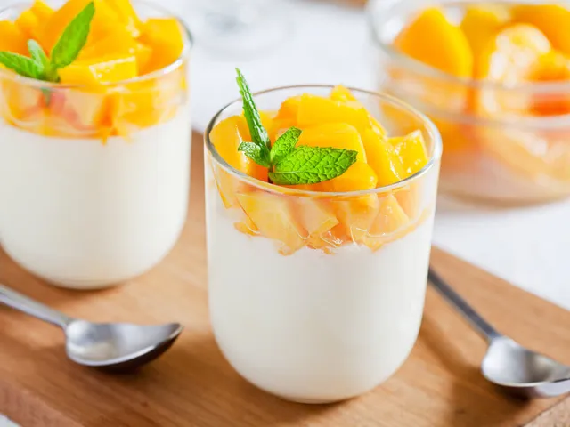 - Cubos de manga e folhas de hortelã para decorar